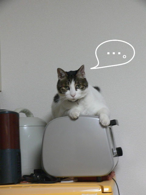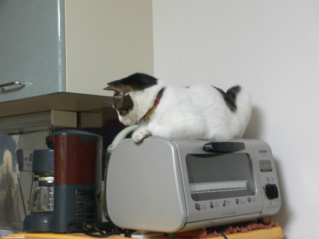 待ちくたびれたようで、オーブンの上に座り込み。
