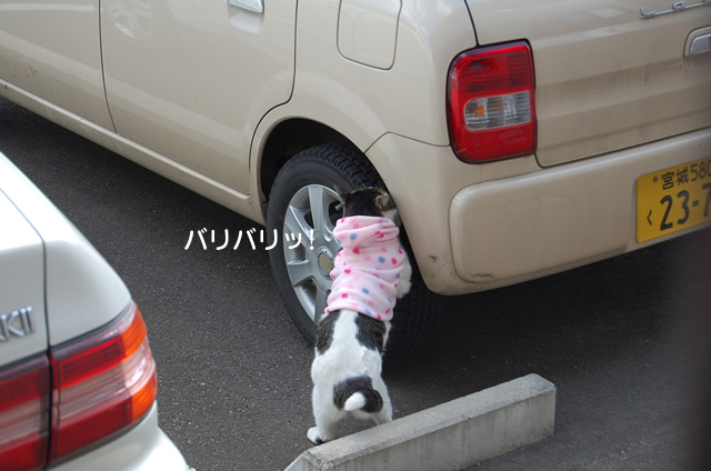 ハナミチ君、車のタイヤで爪とぎですか@0@