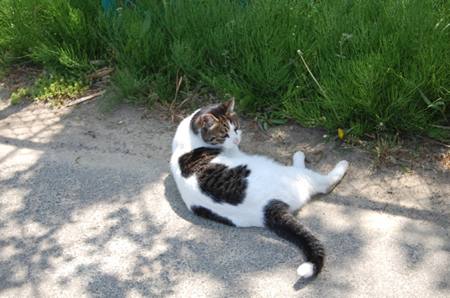 いつだったか、お散歩してるワンコに気づいてそっと身を隠していたハナミチくんとは別猫のようでおかしい...(笑)